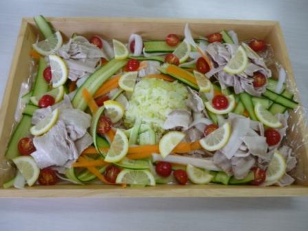 今日のメニューは、お刺身、豚しゃぶ、炊き込みご飯、冬瓜の炊き合わせ、デザートです