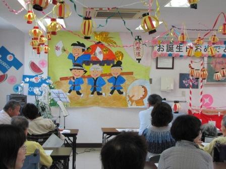平成24年7月お誕生日会を開催しました。 2012年7月30日イベントIKOMA-HP-EVENT-KANRISYA-AKAUNTO 7月生まれの方のお誕生日会が行われました。もちろん、今回も色鮮やかなケーキの登場です! 7月と言えば「お祭り」ということで、ちょうちんを飾りました! リコーダーとウクレレの演奏にのって、体操です!写真は「大きな栗の木の下で」です♪